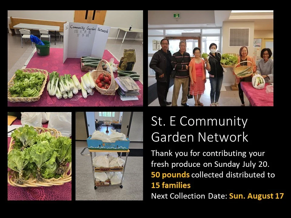 The Mission Ministry will continue to collect fresh vegetables, either planted or purchased by church members, on October 19 (Sunday), for the 'Community Garden Network.' We will donate these vegetables to Mississauga Food Bank the next day.