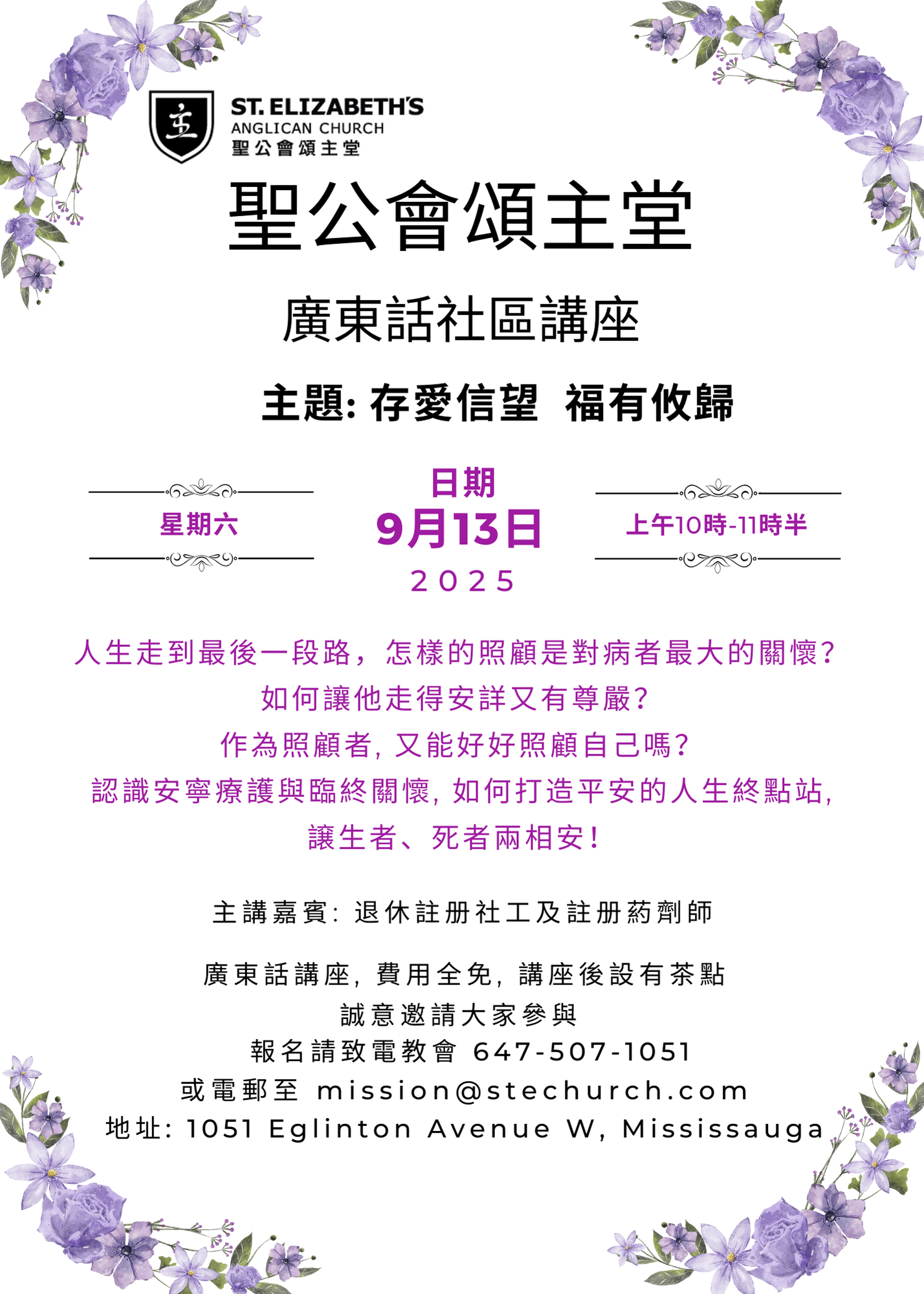 報名:請聯絡聖公會頌主堂鄺姑娘 (Angela Kwong) (647) 507-1051 (手提)/(905) 812-2938 (辦事處)
